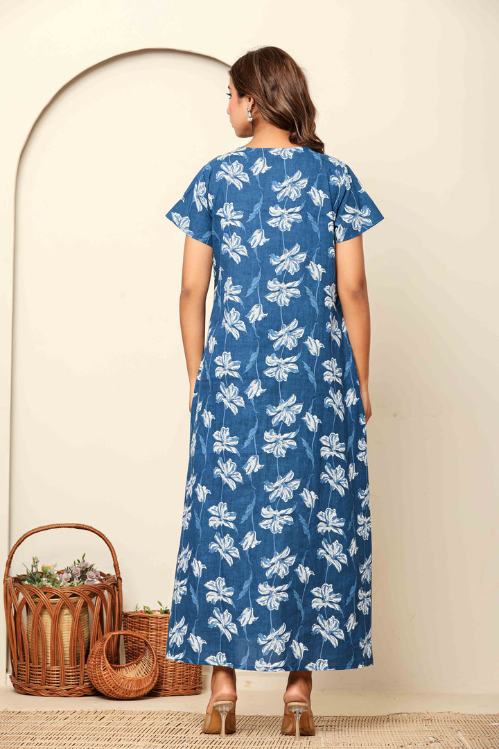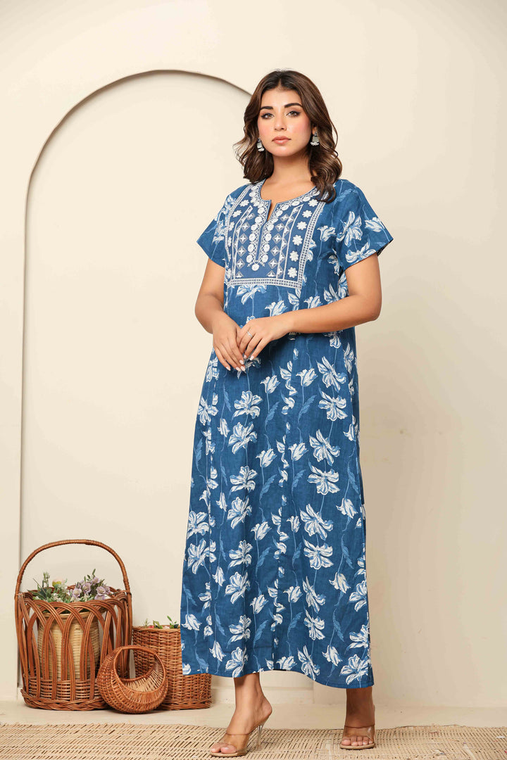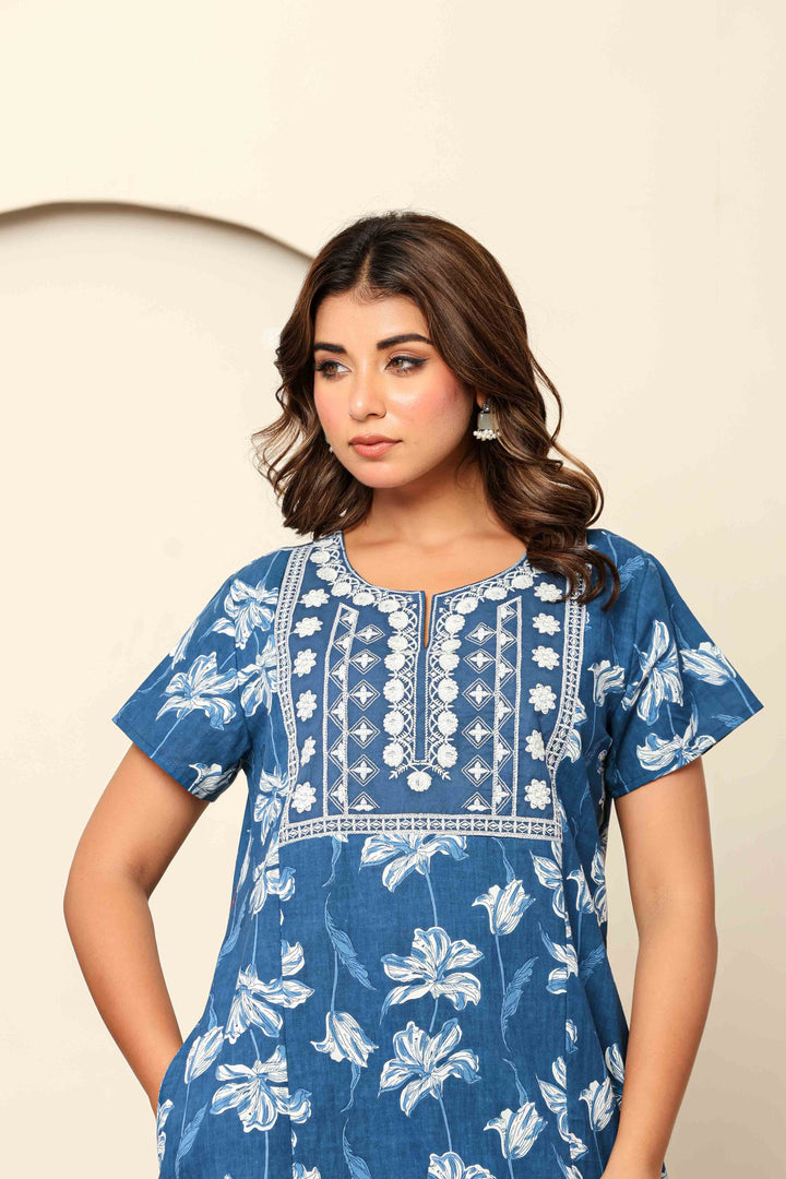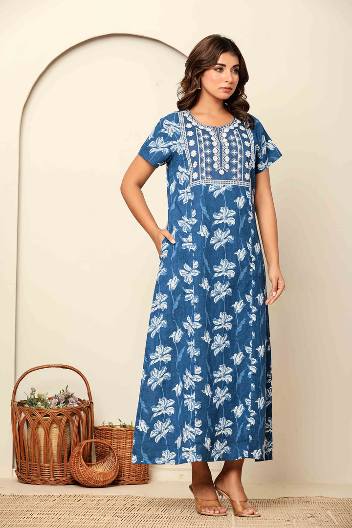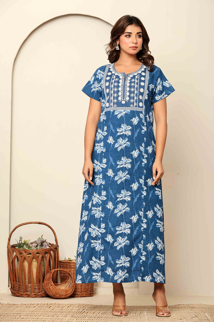 Experience comfort and elegance with the Blue Cotton Premium Printed Embroidered Nighty. Crafted from high-quality cotton, this nighty offers breathability and softness for a restful night's sleep. Its intricate embroidery and vibrant print add a touch of sophistication, making it ideal for both relaxation and style. Designed for durability and ease of care, this nighty combines premium fabric with expert craftsmanship to enhance your nighttime wardrobe.