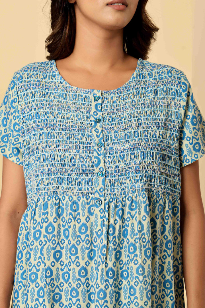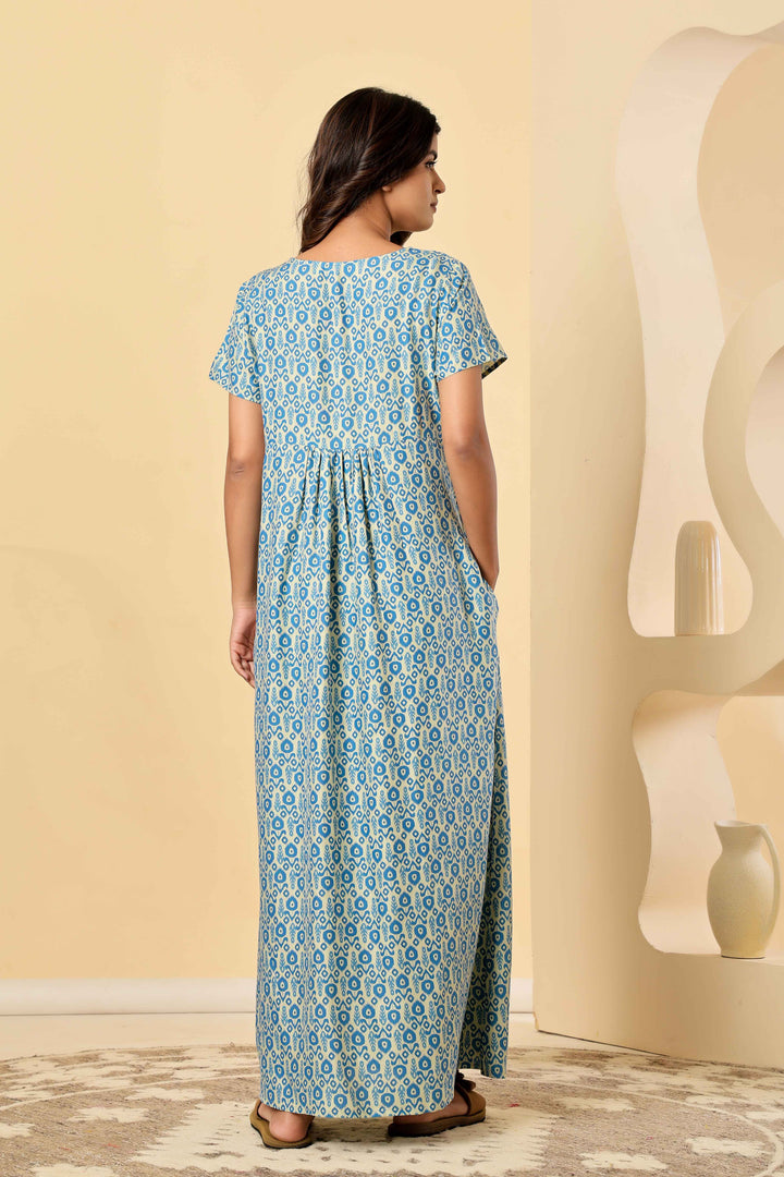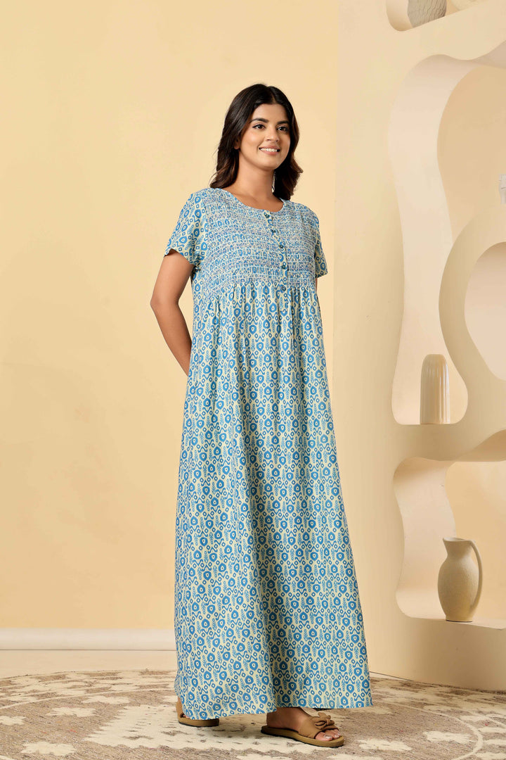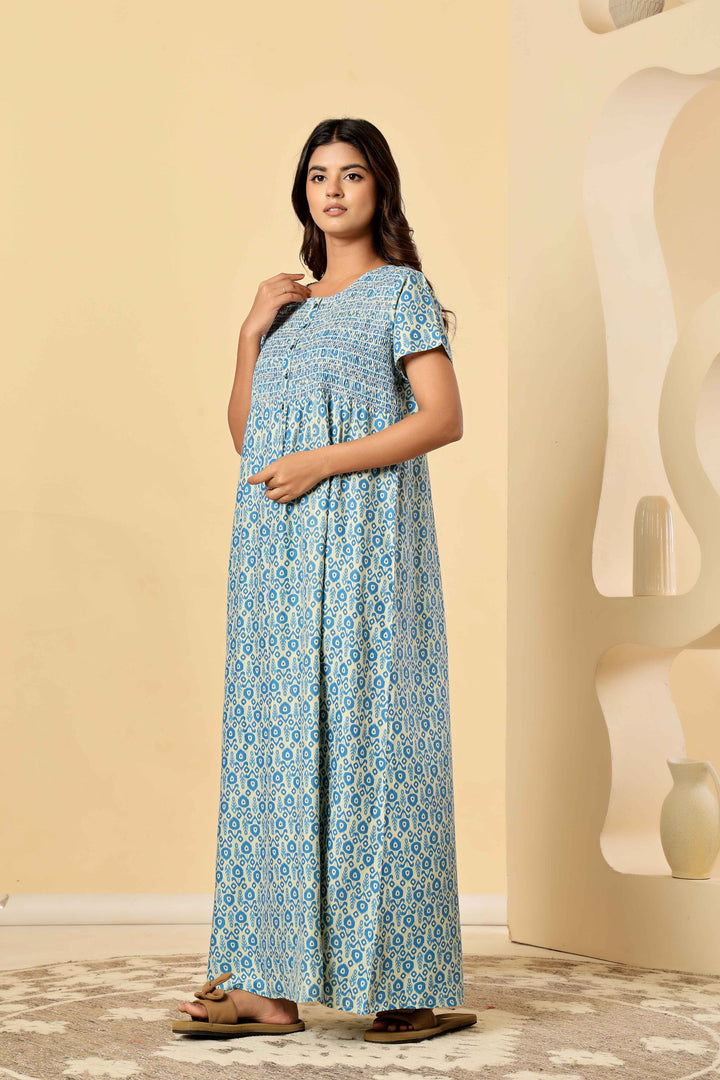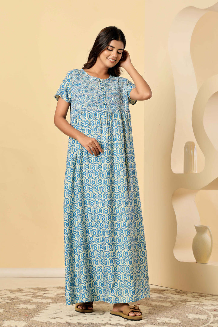 The Blue Viscose Premium Smocked Nighty combines comfort and style with its breathable viscose fabric and expertly crafted smocked detailing. This nighty ensures a flattering fit while providing lightweight softness for a peaceful night's sleep. Its premium construction offers durability and a smooth feel against the skin, making it an excellent choice for those seeking quality and elegance in their nightwear.