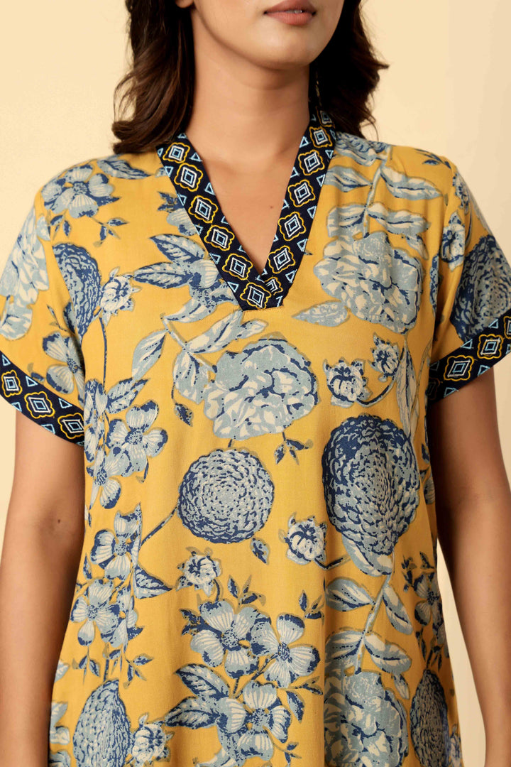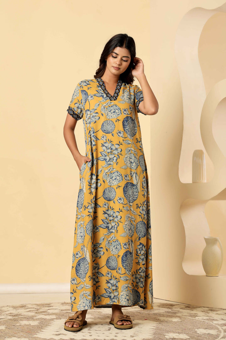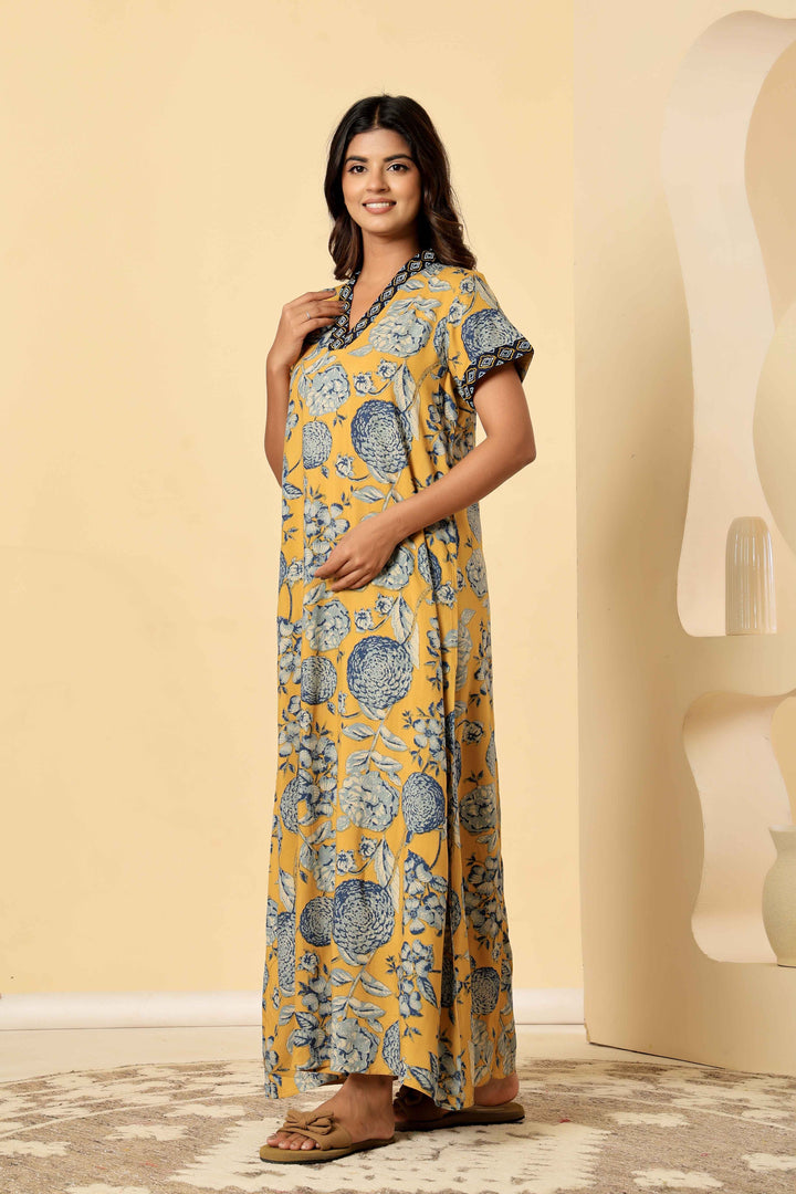 Mustard Viscose Premium Embroidered Nighty