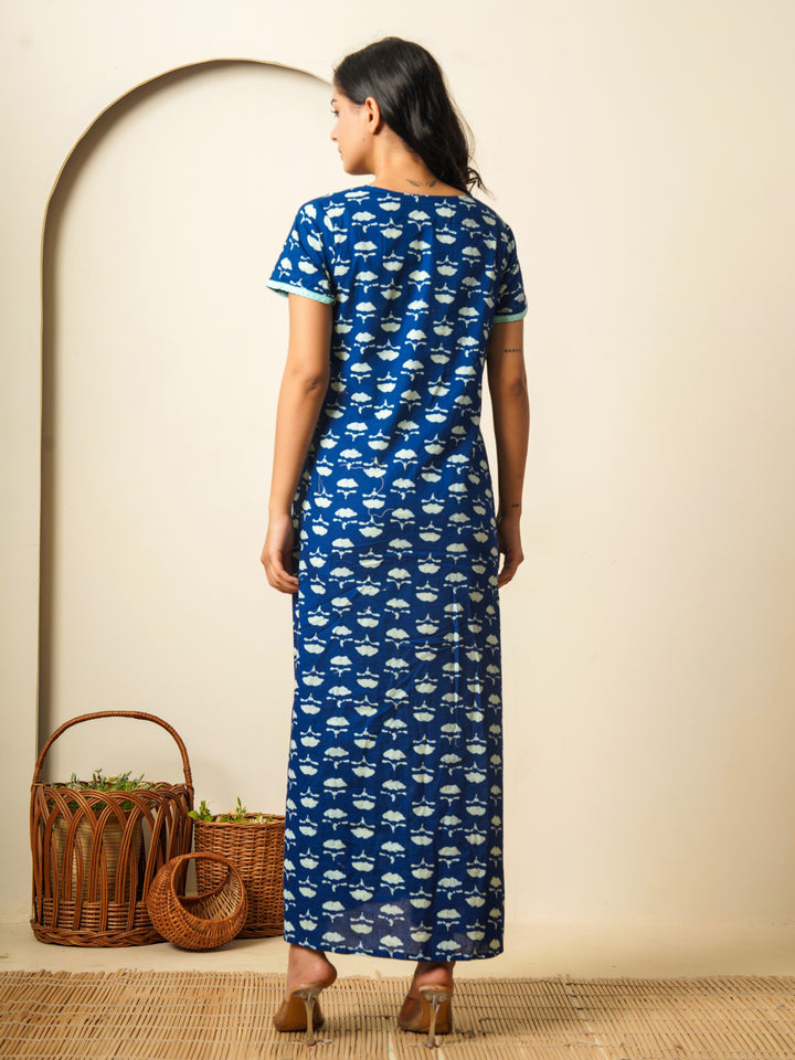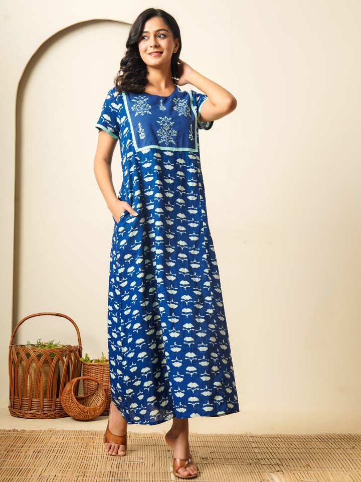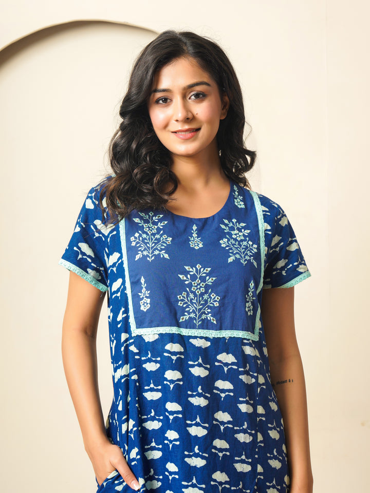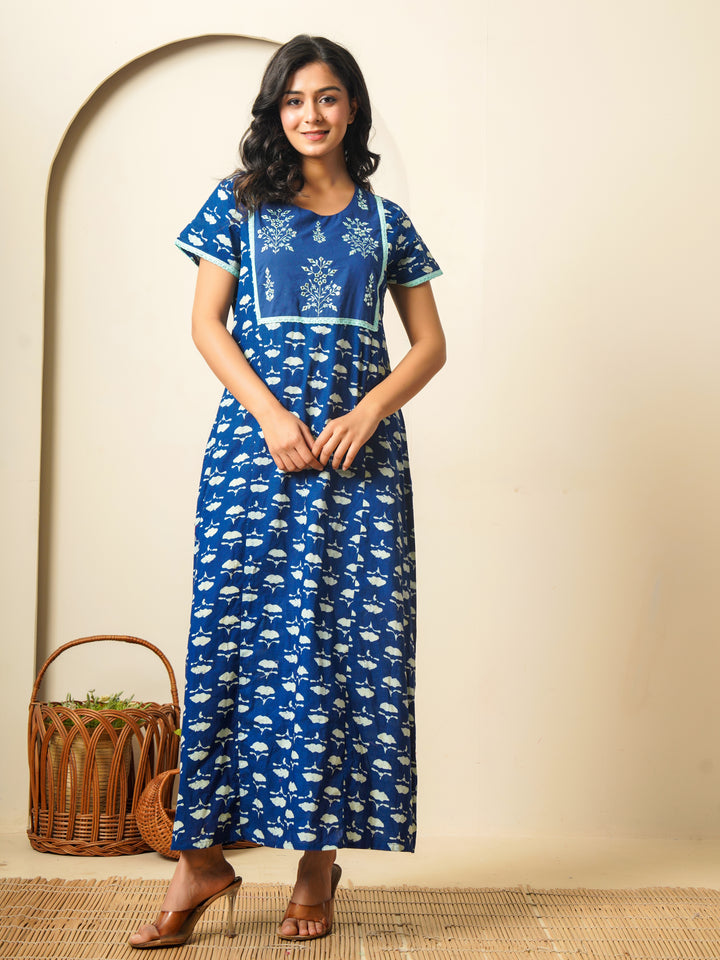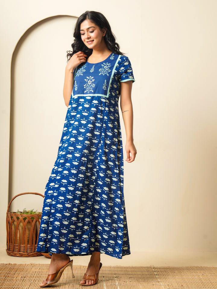 The Navy Blue Cotton Premium Printed Embroidered Nighty combines breathable cotton fabric with intricate embroidery for a luxurious nightwear experience. Its premium quality ensures softness and durability, while the printed design adds a stylish touch. This nighty offers comfort and elegance, making it ideal for relaxing evenings and restful sleep.