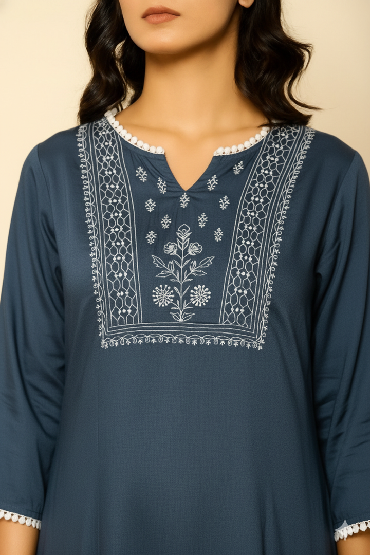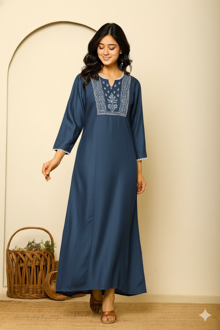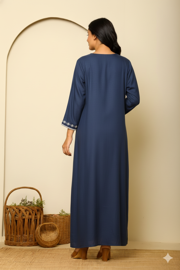 Experience comfort and elegance with this Navy Blue Viscose Premium Embroidered Nighty. Crafted from soft viscose fabric, it offers breathability and a gentle feel ideal for restful nights. The intricate embroidery adds a refined touch, making it a stylish yet practical choice for sleepwear. Designed to provide a relaxed fit, this nighty ensures ease of movement while maintaining a sophisticated look.