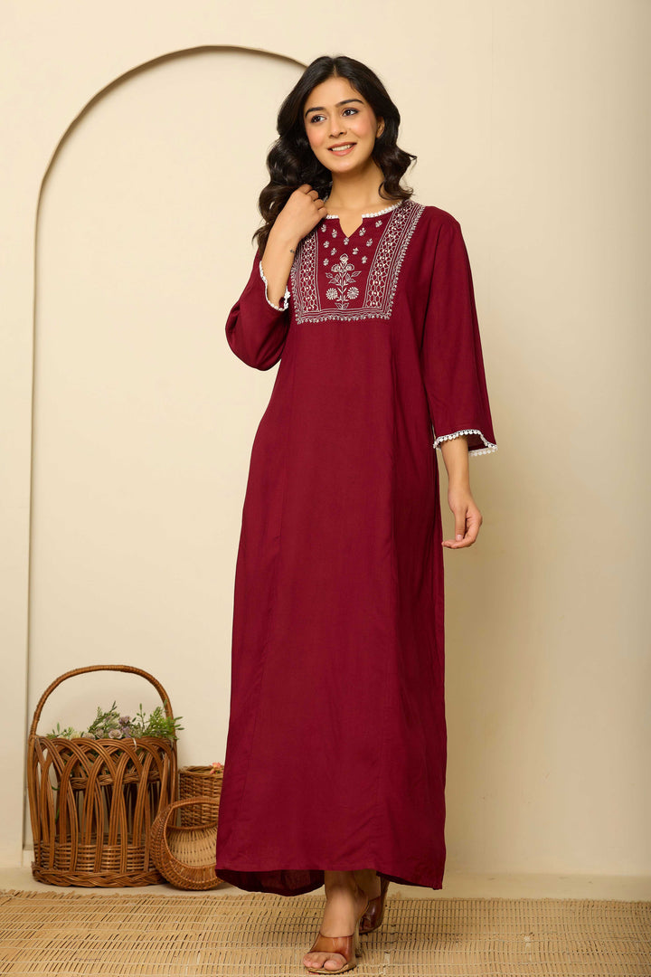 Crafted from premium viscose fabric, this embroidered nighty offers both comfort and elegance. Its breathable material ensures a soft, cool feel against the skin, ideal for restful nights. The detailed embroidery adds a refined touch, making it perfect for those who appreciate quality and subtle style in their nightwear.